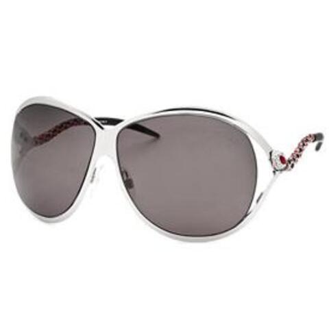 Modern and Cool Sunglasses from Roberto Cavalli with round Glasses. With a beautifull snake detail in red-blue-silver on the sides. With stones on the snake. Exclusive and elegant sunglasses for the perfect woman. Comes in a Hardcase with Marcolin papers and Polishing Cloth.